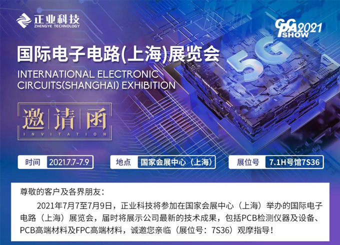 2021年7月7至7月9日,正業(yè)科技將參加在國家會展中心(上海)舉辦的國際電子電路(上海)展覽會,屆時將展示公司最新的技術(shù)成果,包括PCB檢測儀器及設(shè)備、PCB高端材料及FPC高端材料,誠邀您親臨(展位號:7S36)觀摩指導(dǎo)!