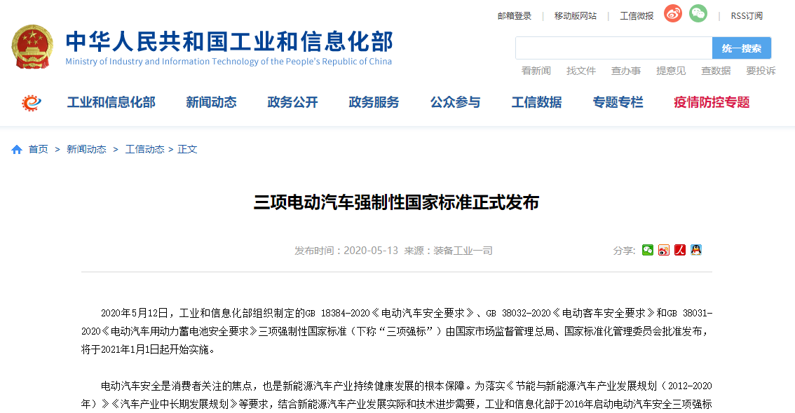 2020512日,工業和信息化部組織制定的GB 18384-2020《電動汽車安全要求》、GB 38032-2020《電動客車安全要求》和GB 38031-2020《電動汽車用動力蓄電池安全要求》三項強制性國家標準由國家市場監督管理總局、國家標準化管理委員會批準發布,進一步提高和優化了對電動汽車整車和動力電池產品的安全技術要求。